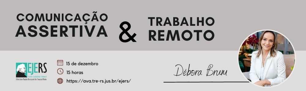 A EJERS informa que a palestra “Comunicação Assertiva no Trabalho Remoto", conduzida pela fonoaudióloga e coach Débora Brum, foi remarcada para 15/12/2023, às 15 horas.